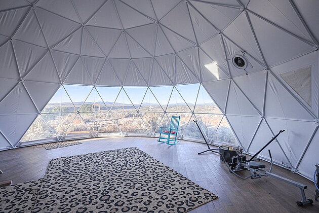 Uvnitř kupole je prostorný sál pro lekce jógy nebo wellness.