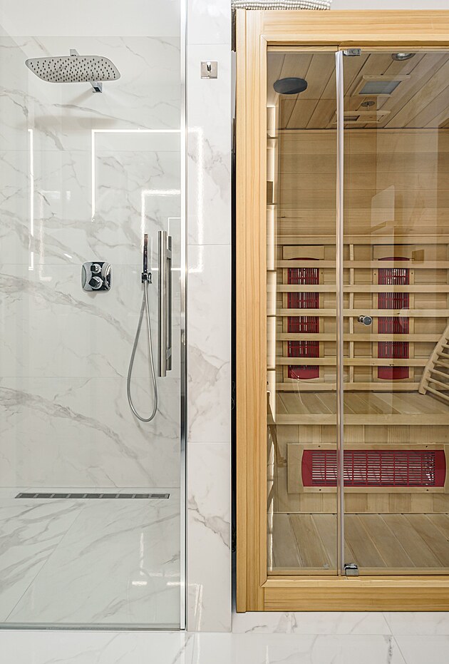 „Klientka vyjádřila přání vytvořit v interiéru kout určený k relaxaci. A sauna se nám po společných debatách jevila jako ideální řešení,“ vysvětluje změnu designér a pochvaluje si proces její instalace.
