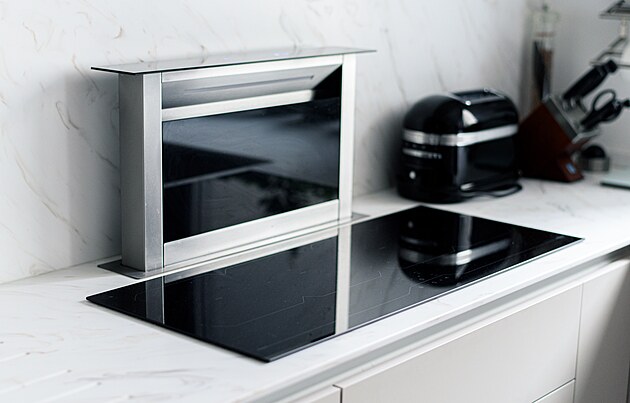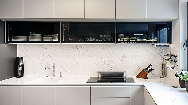 Na opačné straně centrálního prostoru je pak kuchyňská linka, kterou opět truhlářsky řešil sám Branislav Mikitka. Designovou čistotu kuchyňských skříněk převážně v bílém provedení podtrhuje odolná pracovní deska přecházející v obklad z umělého kamene Meganite v dekoru věrně připomínajícím mramor.
