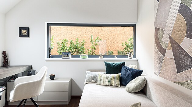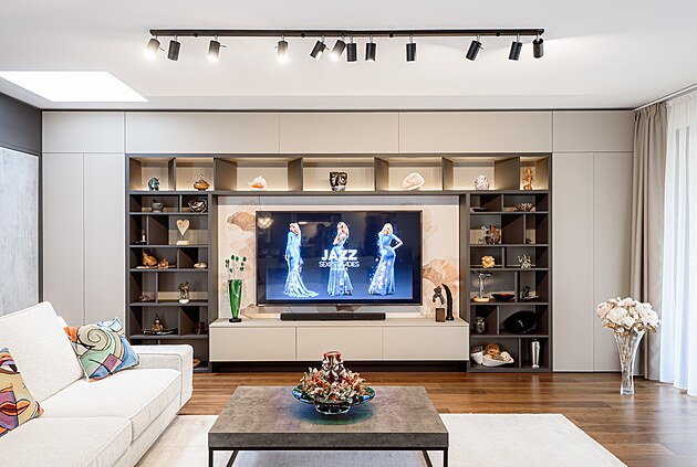 Na přání majitelky je pak do skříně instalovaná klimatizace, která se ovládá elektronicky. Při jejím spuštění se současně otevřou dvířka, za nimiž je schovaná, a stejný synchronní provoz funguje i při jejím vypnutí. Smart technologie se v obývacím pokoji objevují také například ve formě elektronicky ovládaných okenních závěsů.