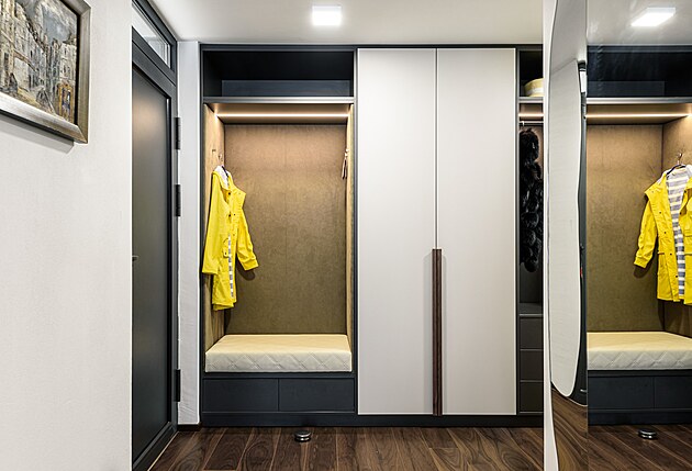 Při návrhu zařízení interiéru vzal designér v úvahu i logický proces příchodu do domu. Součástí předsíně, do které se vstupuje jak garáží, tak i vchodovými dveřmi, je totiž skladovací prostor pro odložení trvanlivých potravin. Tento vstupní prostor je vybavený velkou vestavnou skříni, při jejíž výrobě si designér netradičně vyzkoušel také čalounickou práci ve výklenku, který slouží k sednutí a pohodlnému nazouvání bot.