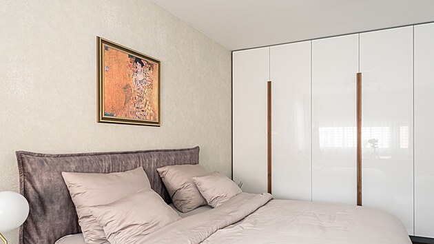 Vysoké šatní skříně jsou vybavené praktickými manuálně sklopnými věšákovými systémy usnadňujícími ukládání oblečení. Zařízení ložnice pak barevně koresponduje s celým interiérem. Její stěny jsou vymalované decentní béžovou stěrkou, k jejímuž nepravidelnému žíhanému dekoru ladí stínovaná potahová látka čela postele.