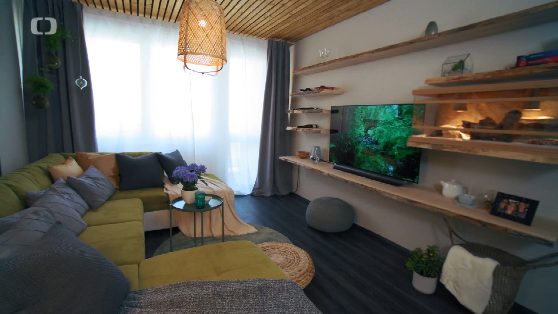 Příjemné prostředí dotváří závěsné mechové koule s pokojovými rostlinami a aerárium - baňka se živou rostlinou, která žije ze vzdušné vlhkosti. Proměnila se i navazující lodžie. Na zemi je položený umělý trávník, zábradlí kryje rohož a celek doplňuje osvětlení se stmívači a posezení. Do rozpočtu se návrhář vešel. Z výsledku je Radka je nadmíru spokojená.