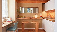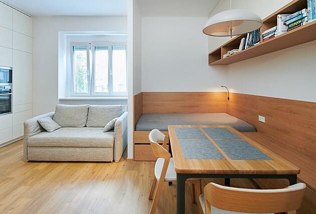 Spací zónu odděluje příčka poskytující soukromí, aniž by zbytečně uzavírala prostor. Jídelní stůl navazuje na nábytkovou sestavu od postele, část skříněk zde slouží také jako lavice.