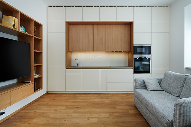Hlavní obytná místnost kombinuje kuchyňský kout podél jedné stěny, který sahá až ke stropu, čímž nabízí dostatek úložného prostoru, aniž by působil těžkopádně. Pod oknem je menší pohovka, zatímco na nosné stěně byla umístěna televize. Požadavek klientky vidět na obrazovku z kuchyně, jídelního stolu, sedačky i postele vyřešil otočný držák.