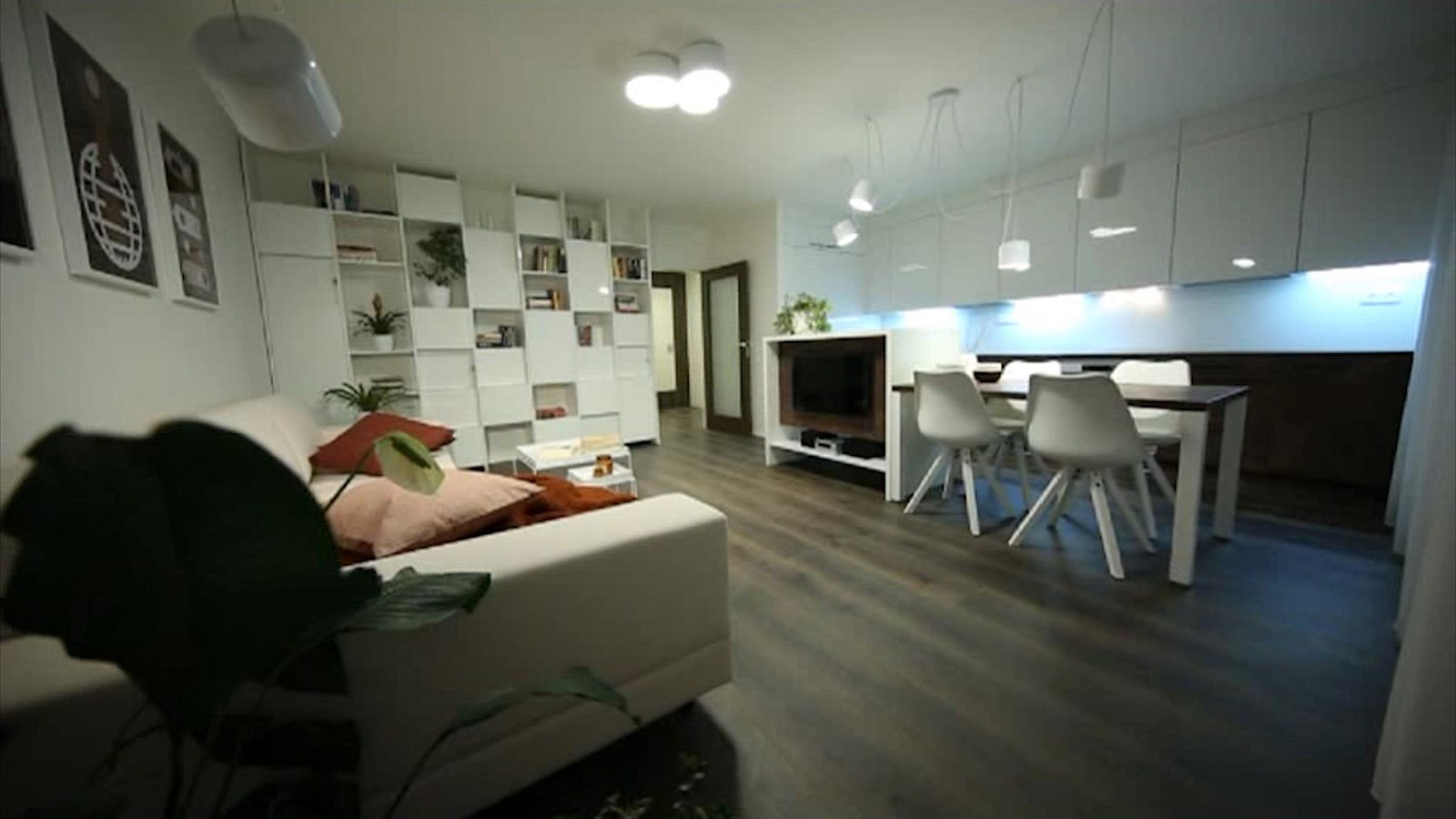 V obývací části je nová prostorná knihovna dělaná na míru, světlá pohovka a kuchyňský ostrůvek, který slouží zároveň jako skříň pro televizi a audio sestavu. Proměna vyšla na 681 774 korun.