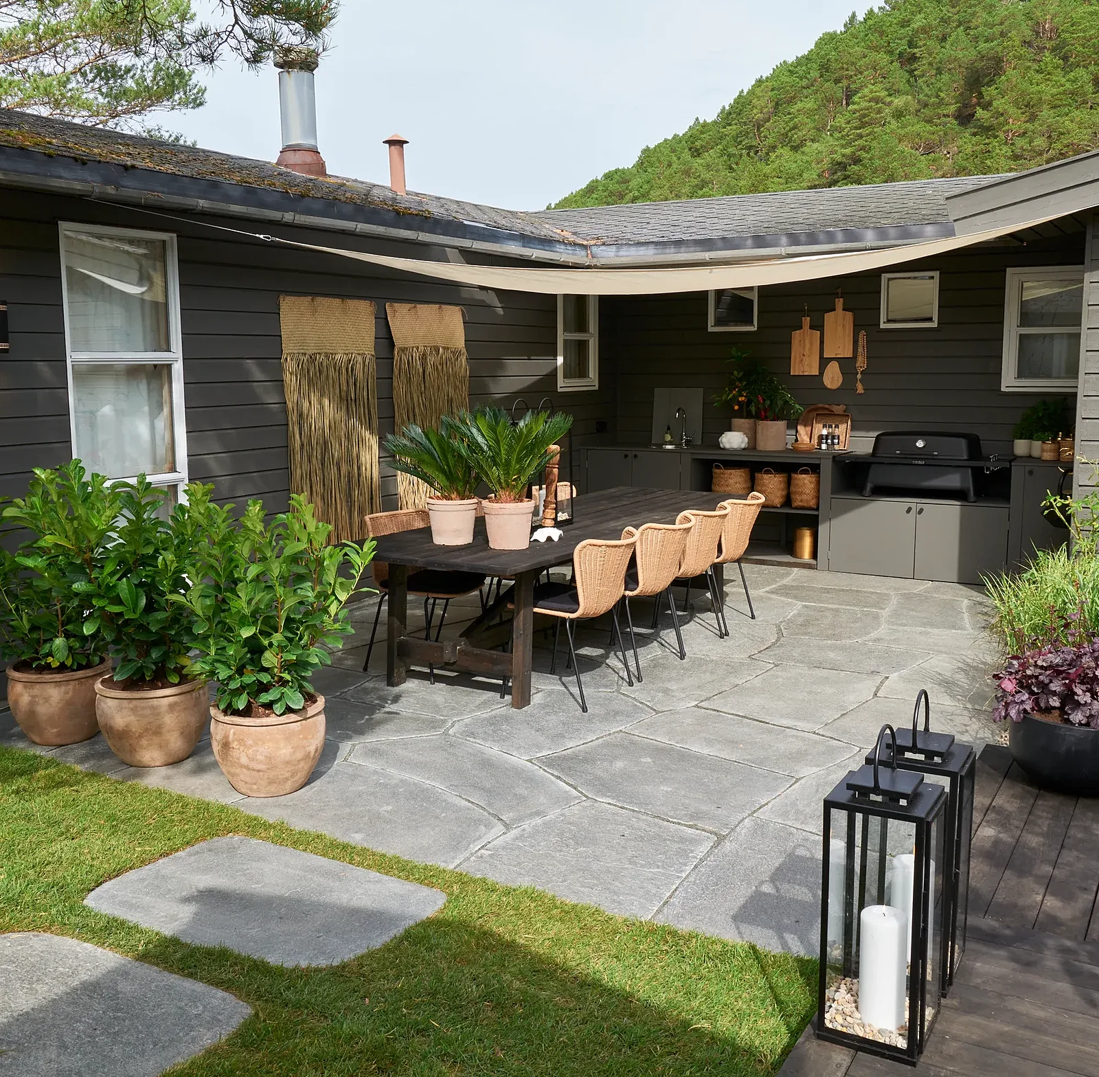 Velkou proměnou prošel prostor „haciendy“, kde se rodiny rády scházejí. Vzniklo zde hned několik zón s různými povrchy: terasa s břidlicí, dřevěná terasa, tráva a plocha s krásným říčním štěrkem. To vše doplněné stylovým nábytkem a rostlinami včetně bambusu dodává místu balijský styl. Přesně, jak si to přál Halvor Bakke.