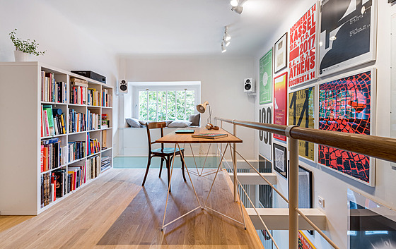 Nad kuchyní je polootevřený prostor určený pro práci i odpočinek, který se podařilo do místnosti vložit díky vysokému stropu. Pokud se o pár schodů níž otočíte na druhou stranu, dostanete se do ložnice a koupelny. Tento soukromý prostor má i svůj vstup přímo z domu.