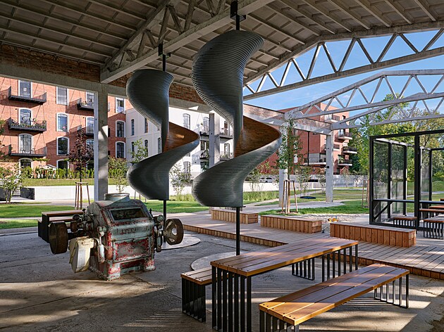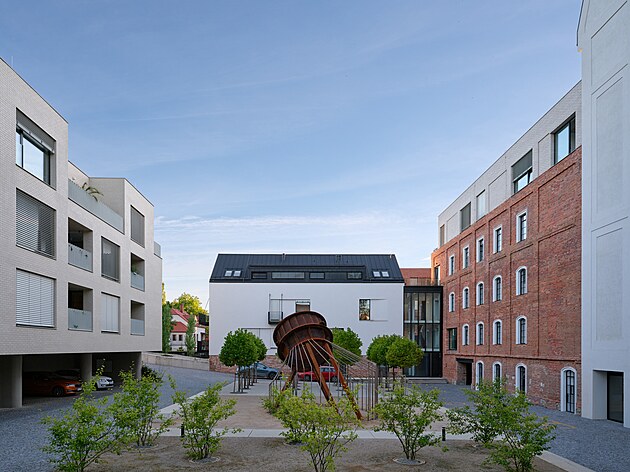 Původní Francisova turbína byla vyzvednuta ze zasypaného náhonu. Náměstí tak není jen obytným dvorem, ale také připomínkou historie a komunitním prostorem.