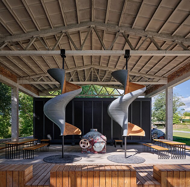 V parku podél řeky architekti zachovali torzo původní garáže.