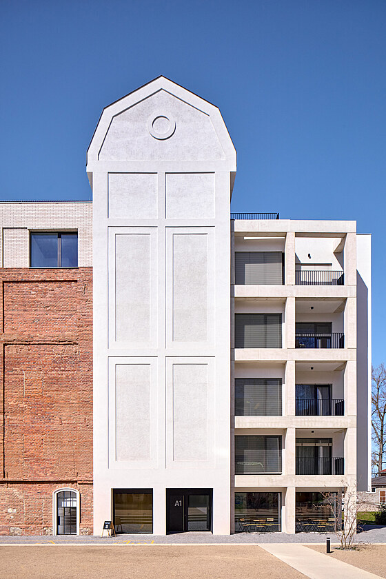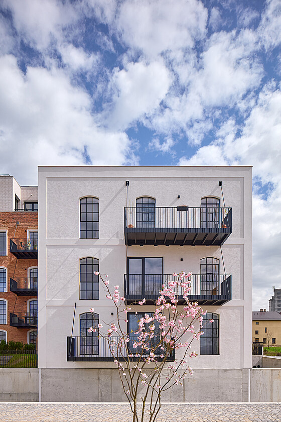 Okna jsou replikami industriálních ocelových výplní, na fasádě směrem k řece jsou přidané černé ocelové balkony. Největší transformací prošla centrální věž, kde vznikl loftový byt.