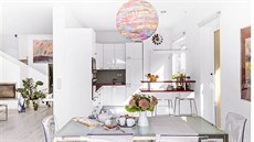 Podlaha v chevron vzoru v běleném odstínu dřeva vytváří zajímavý kontrast k bílé a dodává prostoru dynamiku. Nábytek v bílém provedení navrhla architektka na míru, takže se mohla perfektně propojit funkčnost i estetika.