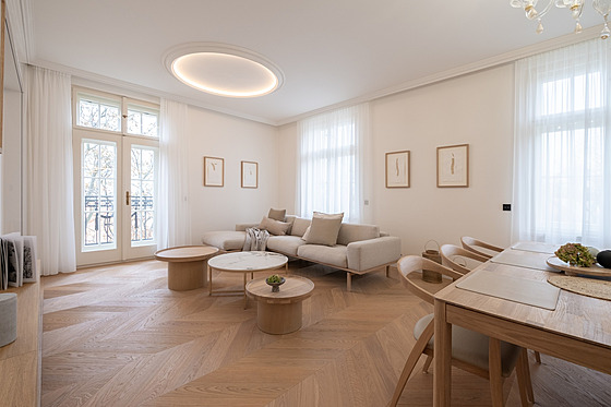 „Tento kombinovaný přístup k designu spojuje moderní minimalismus s historickými detaily, což vytváří prostor, který je zároveň nadčasový a jedinečný,“ vysvětluje architektka Alžběta Vrabcová ze studia DMAE Architects, autorka interiéru.