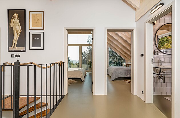 Barvám dominují světlé odstíny, zastoupené betonovou stěrkou od společnosti Pyroex, použitou na podlahách, bílými stěnami a přírodním dřevem. Pohledové krokve a vaznice zde zajišťují uklidňující atmosféru, vhodnou pro klidný spánek, skvěle také korespondují se smrkovou biodeskou a bílou lazurou rámů oken.