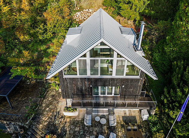 „S návrhem proskleného štítu přišli sami majitelé. Krásně prosvětluje všechny tři ložnice otevřené do krovu, které mají rovnocenný výhled na rozlehlý pozemek,“ popisuje architekt Jan Komárek.