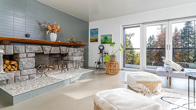 Teplo a pohodlí pro dokonalou atmosféru zimních večerů zajišťuje také rozměrný krb, umístěný v prostoru obývacího pokoje. Ten je z obou stran obložený surovou žulou a vybavený praktickým výklenkem pro uložení dřeva. Právě krb a okolní stěna patří, společně s dlažbou a točitým schodištěm v chodbě, k zachovaným prvkům původní chaty.