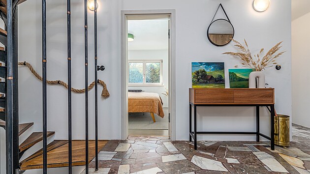 Přízemí a první patro jsou propojeny dřevěným točitým schodištěm, jež je z jedné strany vymezené minimalistickou příčkou, tvořenou černými tyčemi, a z druhé doplněné zábradlím, vyrobeným z robustního lana.