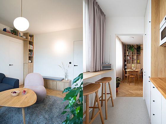 Architekti nechali vybourat otvor v panelu mezi původním pokojem – nejmenší místností v bytě a kuchyní, koupelna se díky tomu zvětšila na úkor původní zbytečné chodbičky, čímž se vytvořil prostor na prostorný walk-in sprchový kout, pračku i úložné prostory. Zároveň došlo k vytvoření ,špinavé’ zóny s botníkem za vstupními dveřmi, přes který už nikdo nemusí několikrát denně procházet do kuchyně.
