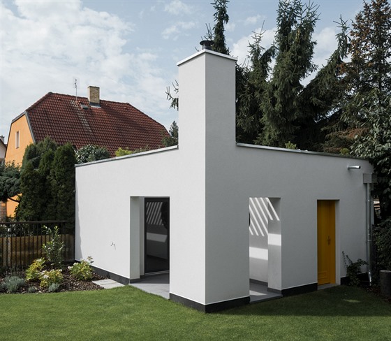 „Měřítko garáže bylo zachováno, jen jsme jej podpořili vertikálou komína vytvářející dominantu zahrady. Střechu jsme nechali osadit zelení,“ doplňuje architekt Hybler. Výrazné a zároveň střídmé tvary malé stavby evokují vzpomínky na funkcionalistickou architekturu.