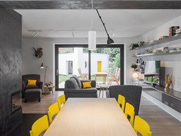 „Nejdůležitějším prostorem v domě je obývací pokoj s kuchyní s přímou návazností na venkovní terasu a zahradu, jeho těžiště představuje tmavý blok s krbovou vložkou. Prostor je opticky dělený výrazným překladem v místě původní nosné stěny,“ vysvětluje architekt David Dvořák.