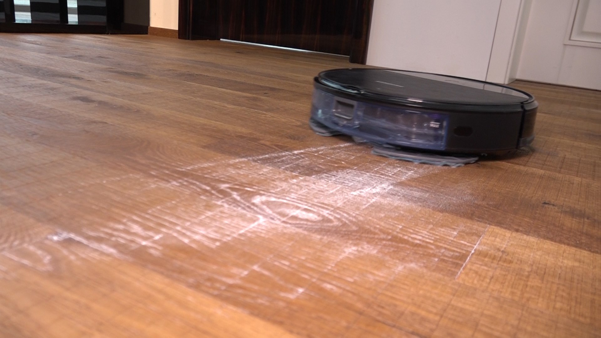 Dávkování vody z nádržky o objemu 0,4 l je u samsungu řízené elektronicky, nastavit lze i rychlost průtoku vody (nízká, střední, maximální) a přizpůsobit ji typu podlahy či znečištění podlahy. Ani u maximálního množství vody však nebyla „vodní stopa“ příliš výrazná, takže se poškození podlahy bát nemusíte.