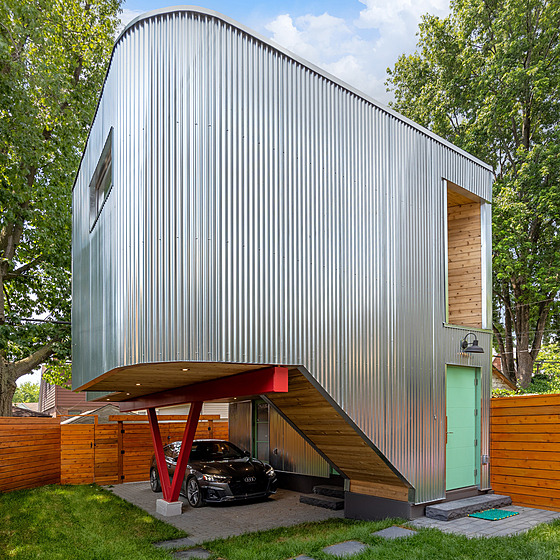 Pocket Laneway House je oděný do lesklého vlnitého plechu (aluzinek) a tyčí se nad přístřeškem pro auto. Architekti zvolili aluzinek (ocelový plech potažený hliníko-zinkovou slitinou) zcela záměrně. Oproti tradiční pozinkované oceli má delší životnost a obstojí i v drsnějších podmínkách.