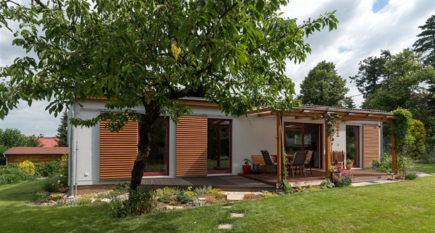 Dům s dispozicí 4+kk a navíc s technickou místností funguje skvěle. Je dobře orientovaný. Velká okna jsou na jih, a když v zimě zasvítí sluníčko, okamžitě zvyšuje teplotu uvnitř. V létě, nebo kdykoli je potřeba, jsou okna krytá žaluziemi nebo dřevěnými posuvnými panely, a uvnitř je příjemně. Svoji úlohu zde má také pergola, která časem zaroste i ze shora. Před deštěm kryje pergolu i terasu deska z makrolonu.