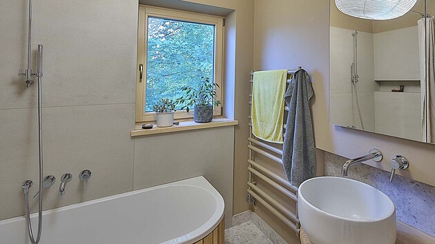 V koupelně doplňuje jasan dlažba imitující kámen. Vestavěný nábytek a další vybavení vyrobily firmy, jejichž práci Jiří znal z realizací svého studia. Pokud jde o kusový nábytek, skládal starý s novým: dvě jídelní židle po babičce (thonetky z padesátých let) doplnil židlí podobného stáří přelakovanou nažluto.
