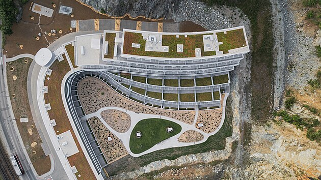 Stavba zasazená do členitého terénu svým tvarem reaguje na okolní podmínky. Přední část funguje jako akustická bariéra podél ulice a plynule přechází do dvorní části, která kopíruje morfologii skalních stěn původního lomu se strmými skalami a plošinami.