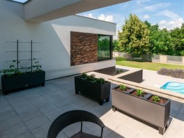 Dům má vlastně několik samostatných křídel, která se spojují u rodinného krbu. Jedno z nich teprve čeká dostavba na letní kuchyň. Lákavé je také atrium „zastřešené“ bohatou vistárií, která v horkém létě poskytuje tolik žádaný stín. Na zahradě se našlo i místo pro zapuštěný bazén s pískovou filtrací a protiproudem.