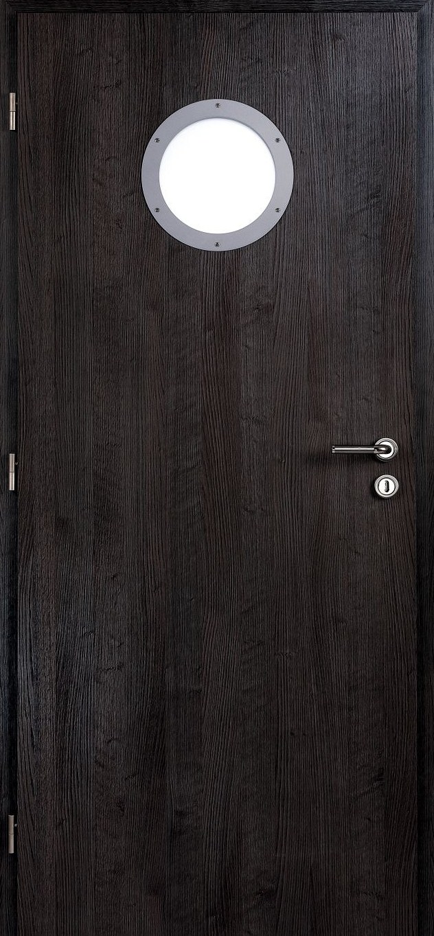 Kajutové dveře Nemo, výplň děrovaná DTD, povrch laminát v mnoha dekorech, okénko z mléčného skla, cena (bez DPH) od 3 800 Kč