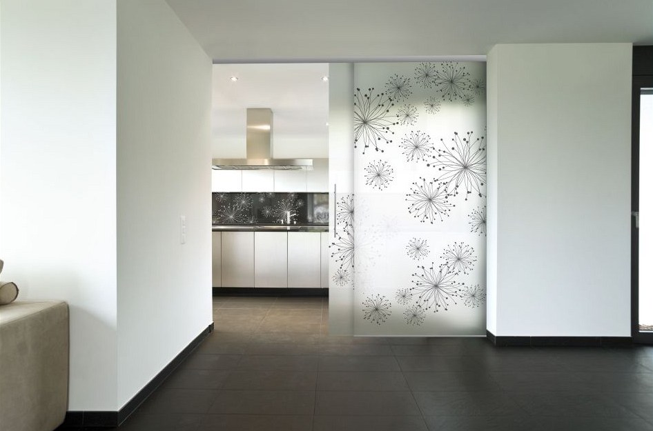 Celoskleněná příčka s posuvnými dveřmi Grafosklo s motivem pampelišky, cena od 7 865 Kč/m2