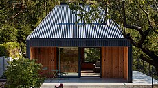 Chata opláštěná trapézovým plechem má seříznutou střechu a v ní světlíky![]() |
