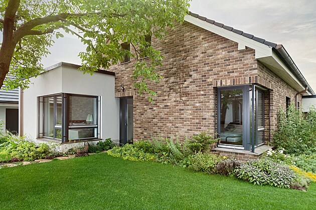 Usedlost tvoří hlavní obytný dům, domek s bazénem, saunou a garáží. Z původního záměru obložit celý dům lícovými cihlami sice sešlo, samotný dům to však oživilo. „Máme lícové cihly velmi rádi, obložili jsme si jimi i náš první dům. Architekt však navrhl na části domu s plochou střechou fasádní omítku. Přes mé původní průpovídky to dopadlo nad očekávání dobře,“ přibližuje Lenka.