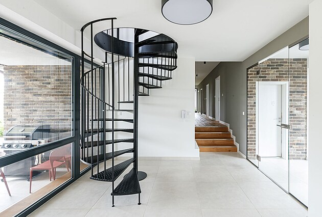 Přízemí je s prvním patrem propojeno točitým kovovým schodištěm v černé barvě. „Dům měl mít zprvu pouze přízemí. Jeho venkovní vzhled by zůstal beze změny, ale v projektu byl zakreslen prostup na ‚půdu‘ v případě, že bychom někdy v budoucnu chtěli podkroví dořešit. Nakonec jsme se rozhodli podkroví dotáhnout rovnou. Vše se tedy dokreslilo. Jen při realizaci jsme si neuvědomili velikost prostupu a následně řešili kulaté, pouhých 160 cm široké schodiště,“ popisuje patálie pro plánování průchodu do podkroví Lenka.