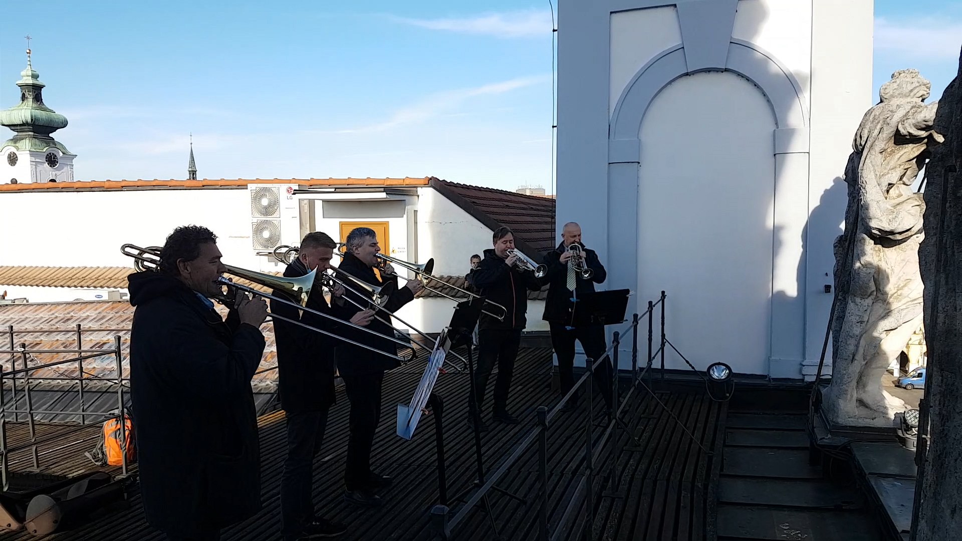 Pětice hudebníků s trumpetou nebo trombonem zdolala v čase oběda spořádaně v rouškách a rozestupech necelou stovku kamenných schodů z radničního vchodu až do stínu jejích tří věží. Ze zázemí té prostřední si muži vytáhli stojany na noty a rozestavili je přímo za alegorickými sochami Moudrost a Opatrnost.