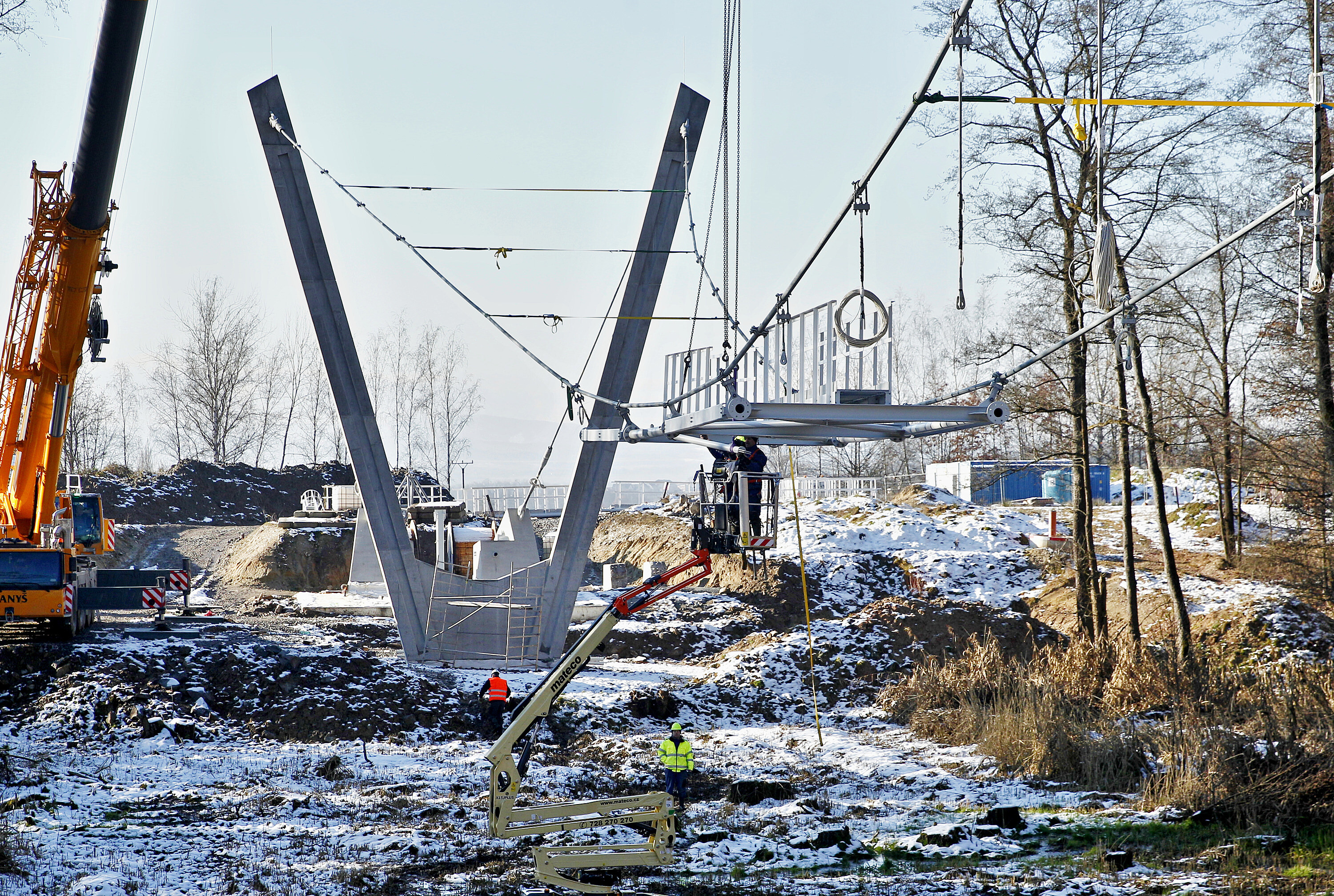 Oba betonové pylony už technici dokončili. Minulý týden instalovali visutá lana a zpětné závěsy. V těchto dnech pracují na usazování vlastní mostovky.