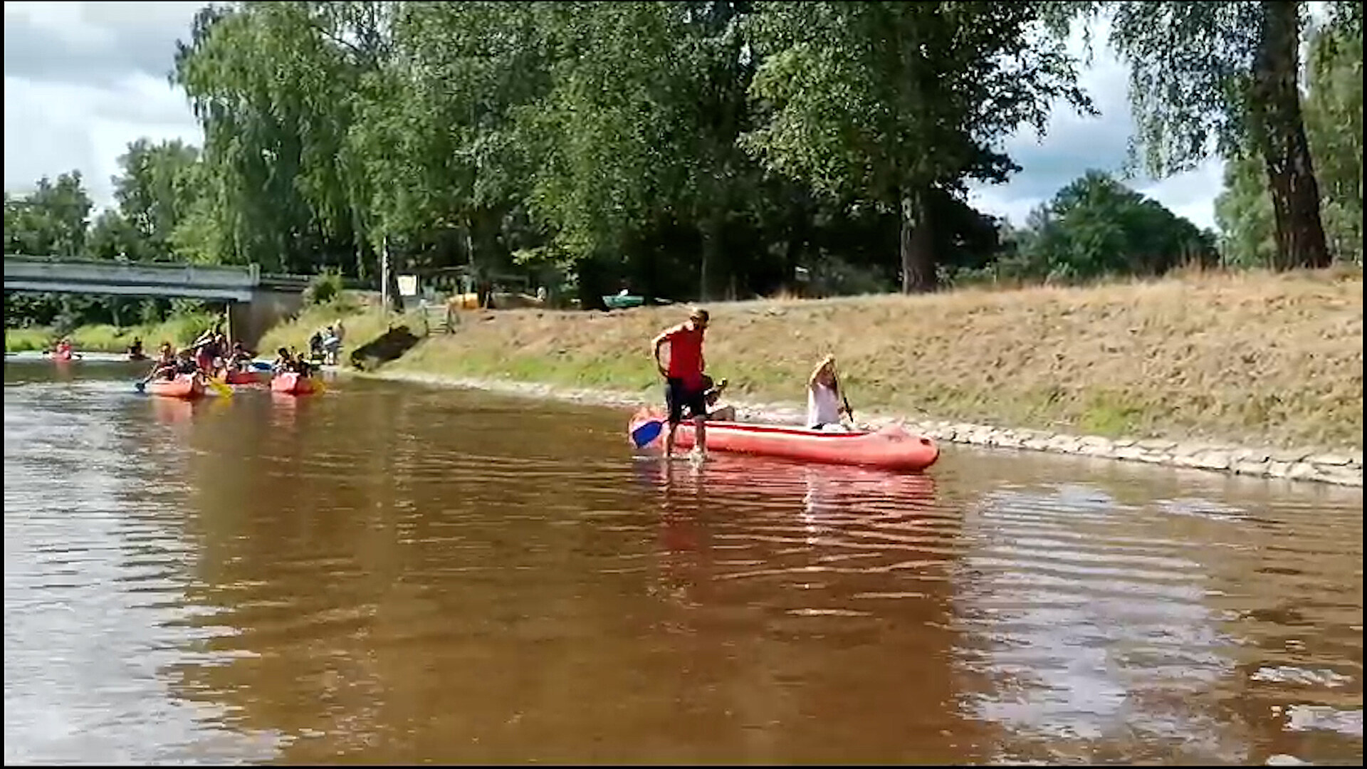 V řece se ráchá dvojice dětí. Vodu mají po kolena. Kolem prochází korytem krátký zástup vodáků, kteří za sebou pomocí pádel vláčí kanoe. Odvážnější se snaží plout, ale dřou loděmi o písčité dno. Vodácké podmínky na Lužnici jsou tento rok kvůli vytrvalému suchu a úbytku vody opravdu špatné.