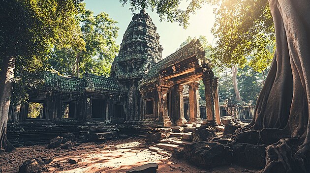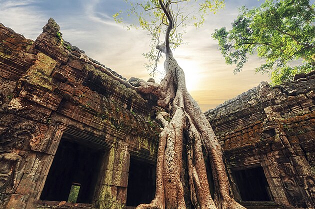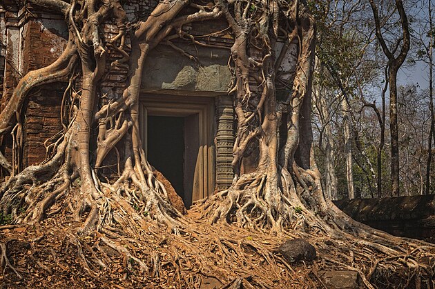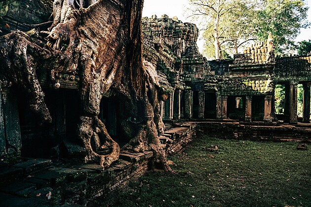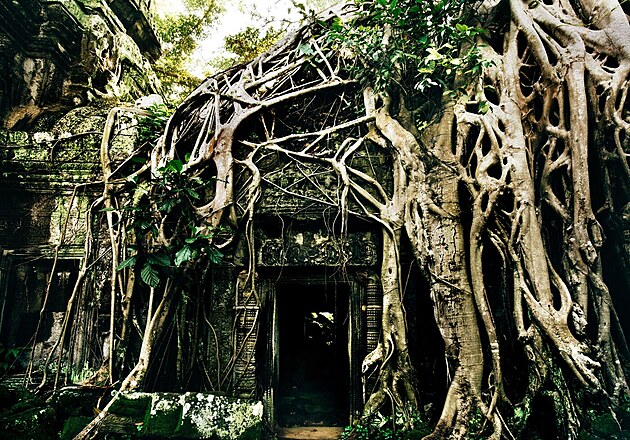 Kořeny obřích stromů prorůstají zdmi chrámu Ta Prohm a vytvářejí dramatickou scenérii. Místo působí téměř magicky.