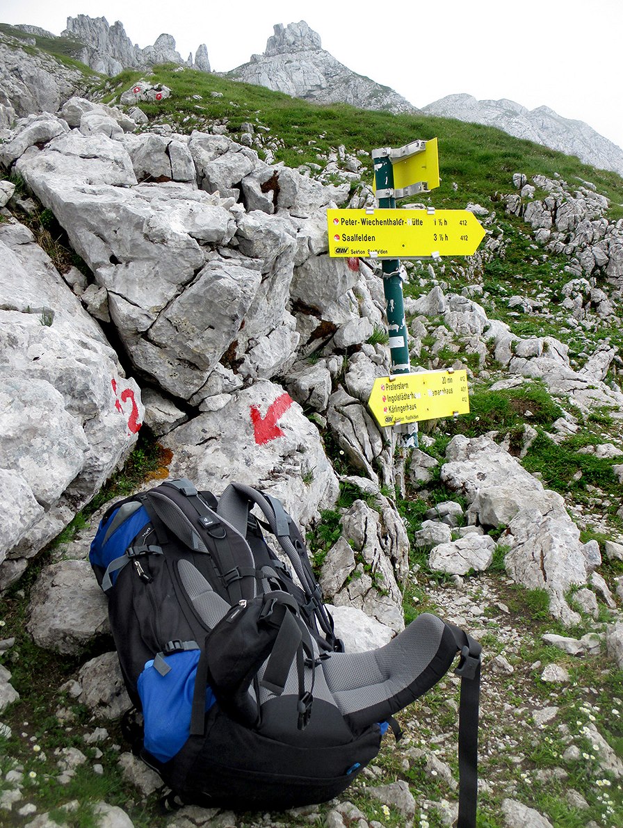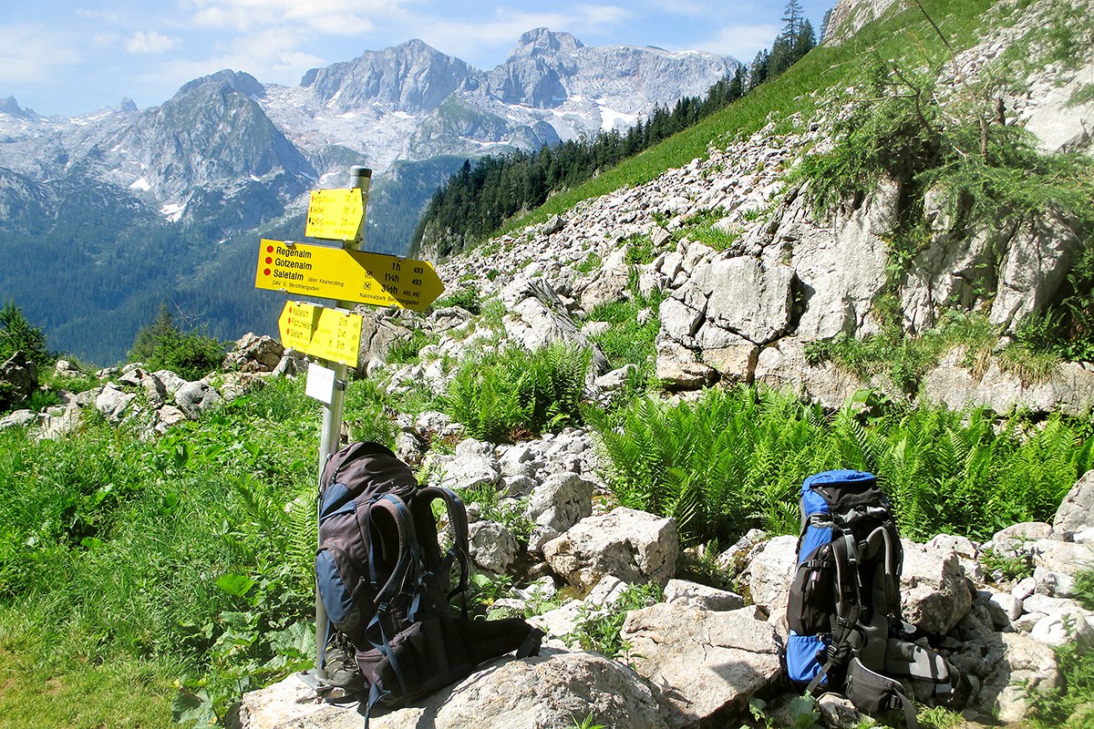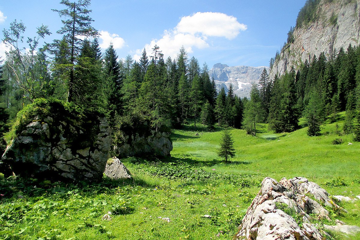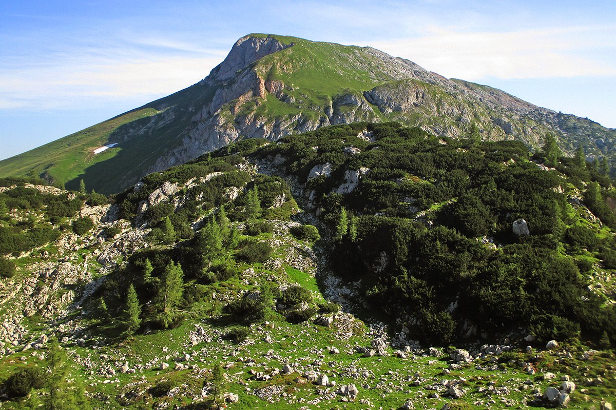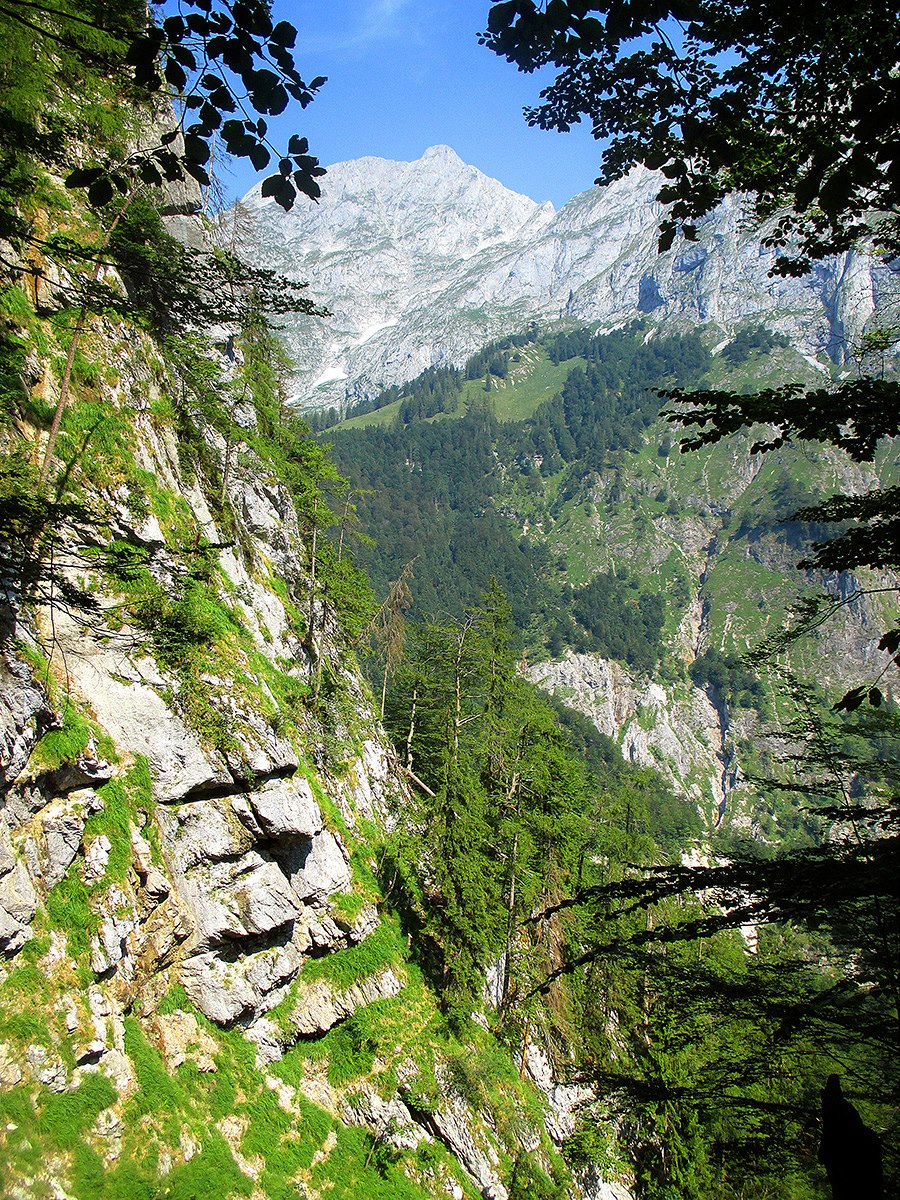 Jeden z mála průhledů při výstupu na hřeben z Gollingu. V pozadí masiv Hoher Göll (2 522 m).