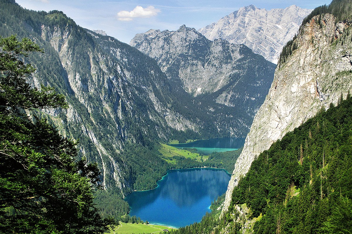 Scenérii s jezerem Obersee (blíže stanovišti) a nejjižnějším cípem Königssee rámuje rozeklaný hřeben Watzmannu.