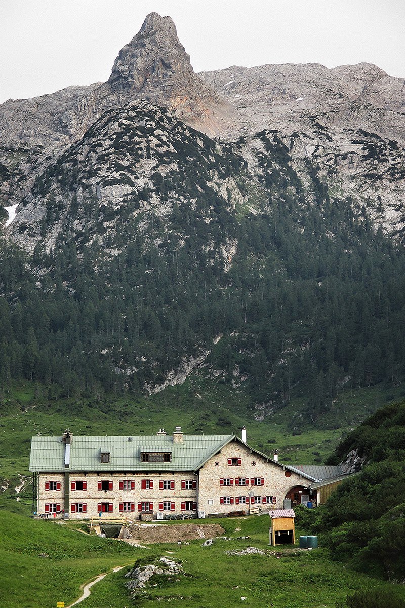 Chata Kärlingerhaus s typickou pyramidou hory Griesskogel (2 543 m)