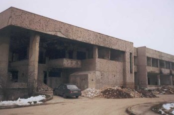 Šla jsem dál, ale místo abych obešla tuhle budovu, zatoulala jsem se kousek dál do sídliště vedle, abych zvěčnila ještě jeden pohled na minulost. Pak už jsem nemocnici oběhla a zabrala její druhou část, už novější. Možná stojí za zmínku, pohled nad nemocnici… Nalevo vykukuje minaret nové, Araby vystavěné mešity s ještě rozstřílenými panelovými domy a napravo zase vedle opraveného dílu nemocnice vykukují nově zrekonstruované domy.