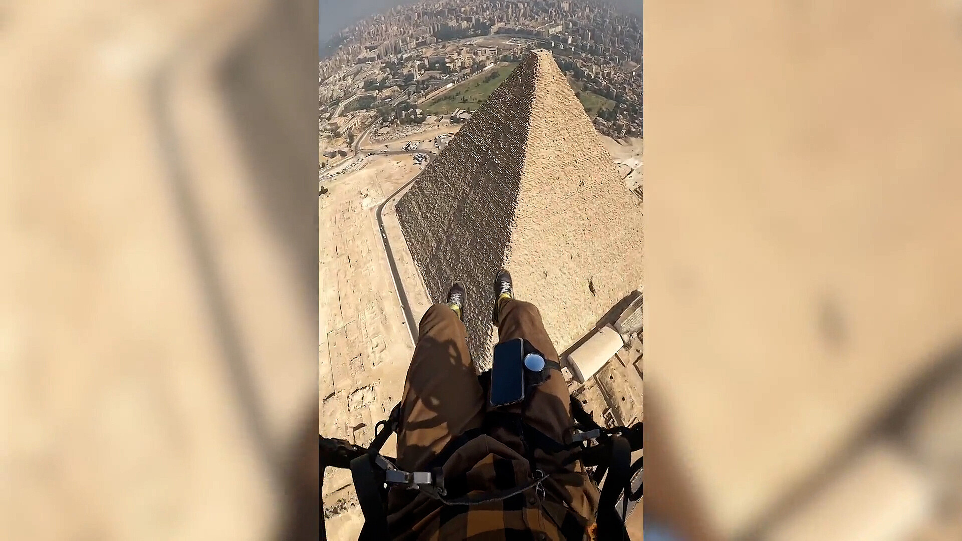 S pomocí paramotoru si tak mohl prohlédnout nejslavnější egyptské památky ze zcela jiné perspektivy. Na videu je zachycen moment, kdy Yanis jen těsně minul vrchol jedné z pyramid ve výšce 137 metrů. Poté zamířil k Velké sfinze.