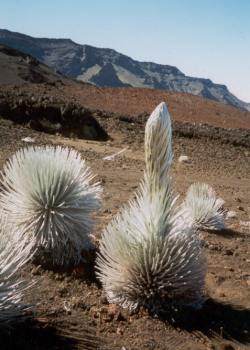 Brzy po dosažení dna kráteru se charakter krajiny poněkud změnil. Objevily se první rostliny - sporadické chomáčky trávy, mechů a lišejníků a především zmíněný silversword. Dostali jsme se na okružní naučnou stezku, lemovanou těmito stříbrnými “ježky”, jež nás zavedla k “lávové trubici “. Ty se hojně vyskytují hlavně na Velkém ostrově - jedná se o jakési tunely vzniklé prouděním lávy, která na povrchu postupně ochladne a ztvrdne a další láva už proudí tímto potrubím.
