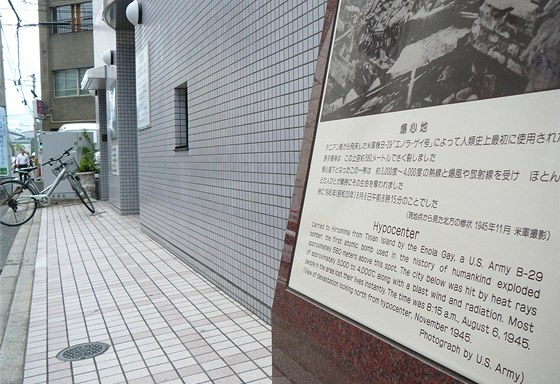 Kousek od ostrova v nenápadné ulici u zadního vchodu do nemocnice najdete ještě jedno opravdu klíčové místo pro celou událost. Prostá tabulka tam označuje epicentrum. Nad tímto místem bomba ve výšce 600 metrů nad městem explodovala.