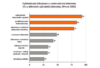 Téměř 80 procent těch, co se na netu zajímají o cestování, hledá informace o místech, kam se chystá na výlet. Necelá polovina uživatelů si rezervuje ubytování a třetina nakupuje přes internet zájezdy nebo letenky.