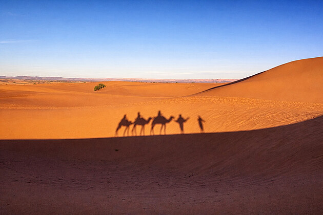 Karavany velbloudů byly po staletí hlavním dopravním prostředkem přes Saharu, zejména na obchodních trasách se solí, zlatem a kořením. Velbloudi jsou přizpůsobeni extrémnímu horku i nedostatku vody a dokážou urazit desítky kilometrů denně. Dnes se karavany využívají hlavně pro turistické přesuny mezi dunami a pouštními tábory.