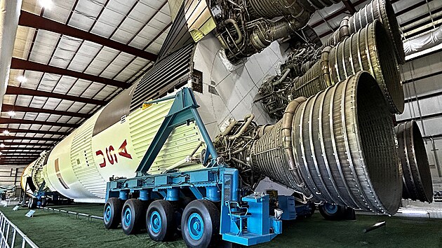 Druhá cesta vláčku vede k hangáru, jehož jediným obyvatelem je kompletní sestava měsíční rakety Saturn V. Kolos, dlouhý 111 metrů, což je o něco více než nástupiště pražského metra, je sestavený ze tří částí raket Apollo, které po předčasném ukončení programu letů na měsíc už nevzlétly.