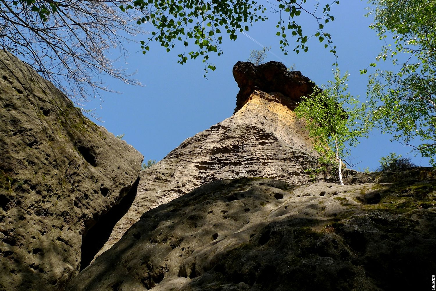 To je asi jediný klad dost rozsáhlé těžby dřeva na Kokořínsku - díky pasekám se otevírají pohledy na jinak zarostlé skály. Jedním z mnoha záporů pak jsou rozježděné cesty s hlubokými bahnitými výmoly. Zejména na jaře nebo po dešti je tak řada lesních cest částečně nesjízdná.